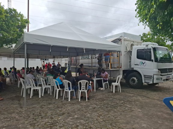Atendimento Itinerante – Agosto. Apoio à Feira de Saúde no Distrito de Sapé. A ação contou com uma Unidade Móvel para a realização de atendimentos especializados, exames e procedimentos, integrando o projeto municipal “Saúde Mais Perto”.
